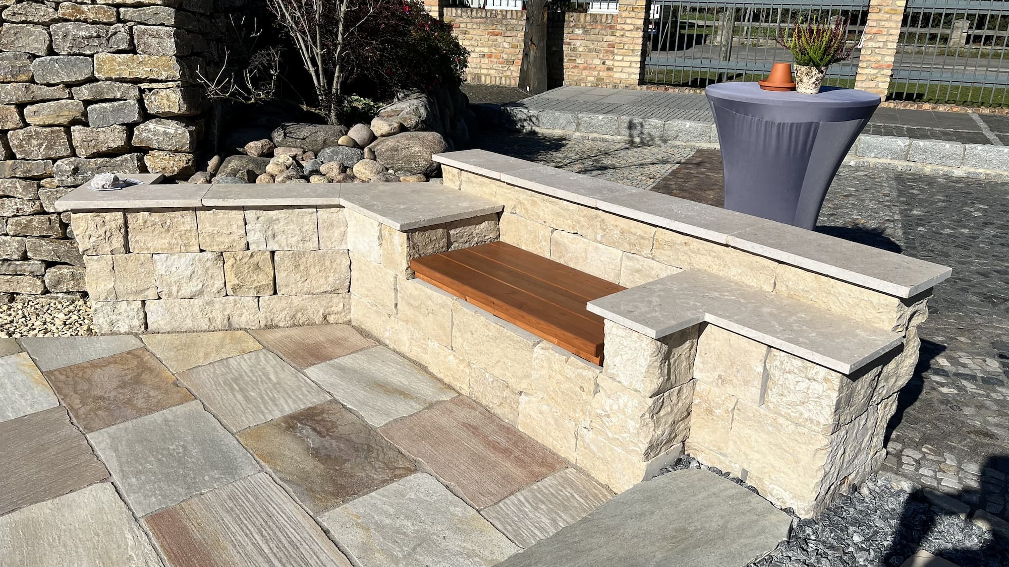 Wir begrüßen Sie auf unserer Terrasse „Bahia“, auf der wir eine abwechslungsreiche Naturstein-Kombination, bestehend aus Terrassenplatten aus Quarzit sowie Mauersteinen aus Kalkstein und Muschelkalk, präsentieren. Das Ergebnis: Eine Outdoorfläche, die optisch viel zu bieten hat und dennoch ein harmonisches Gesamtbild in freundlich-hellen Farbtönen abgibt.