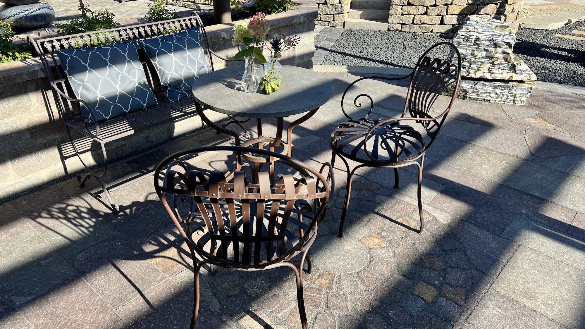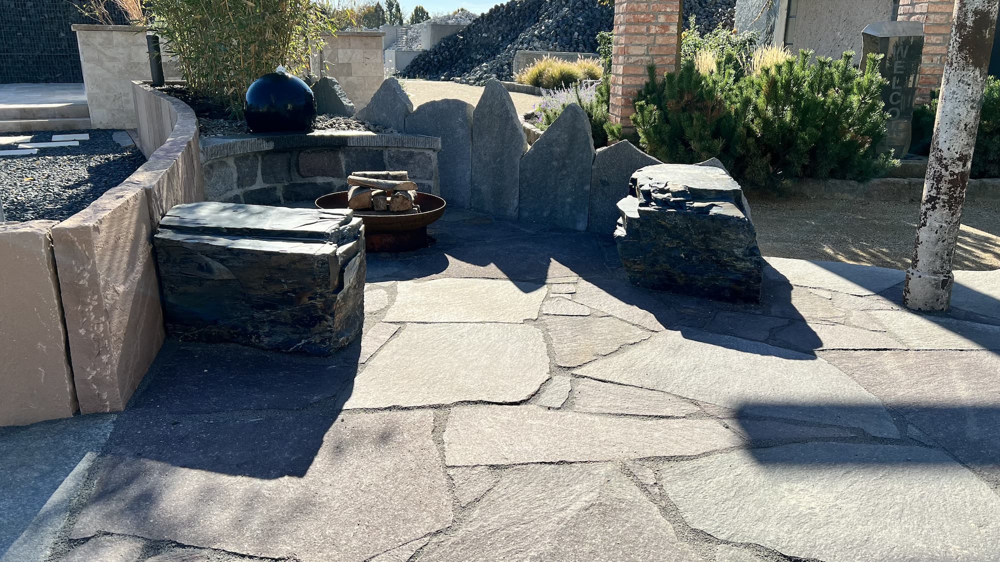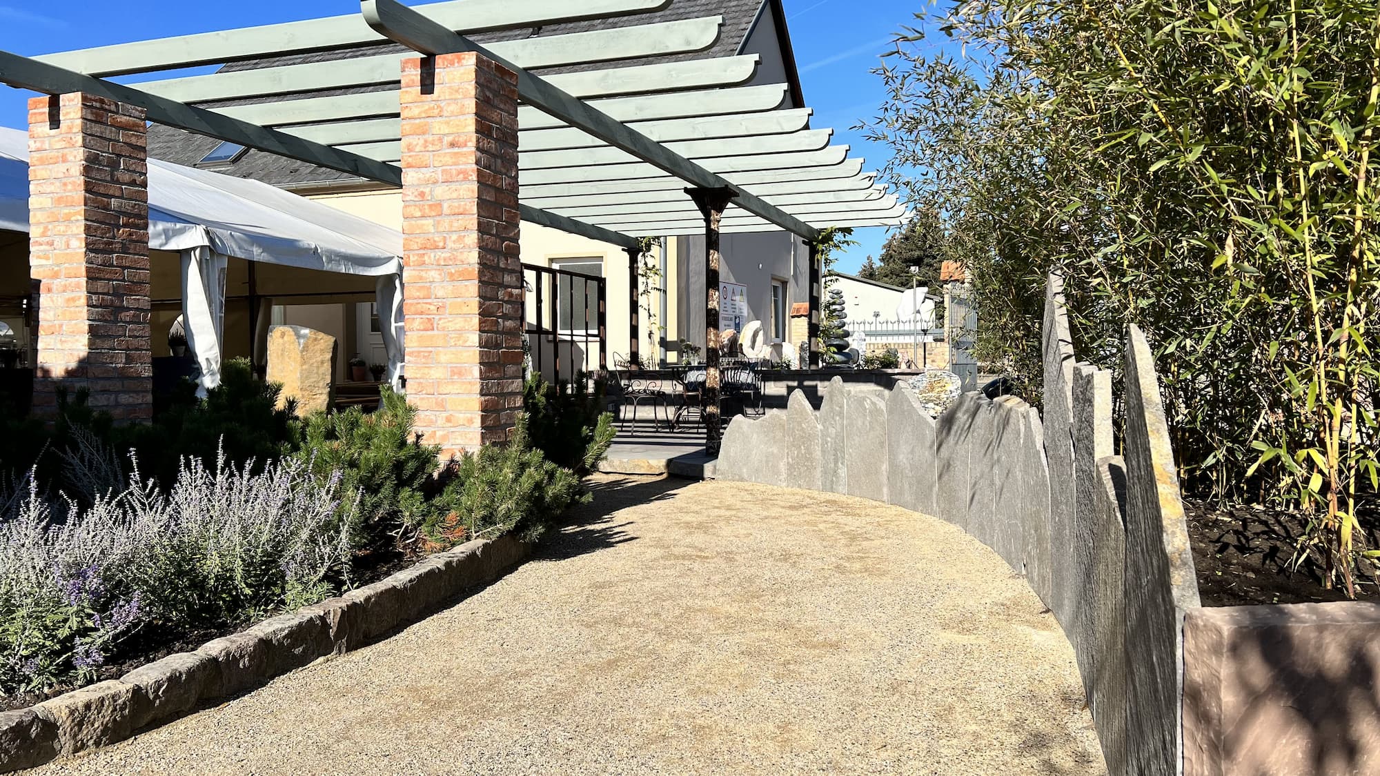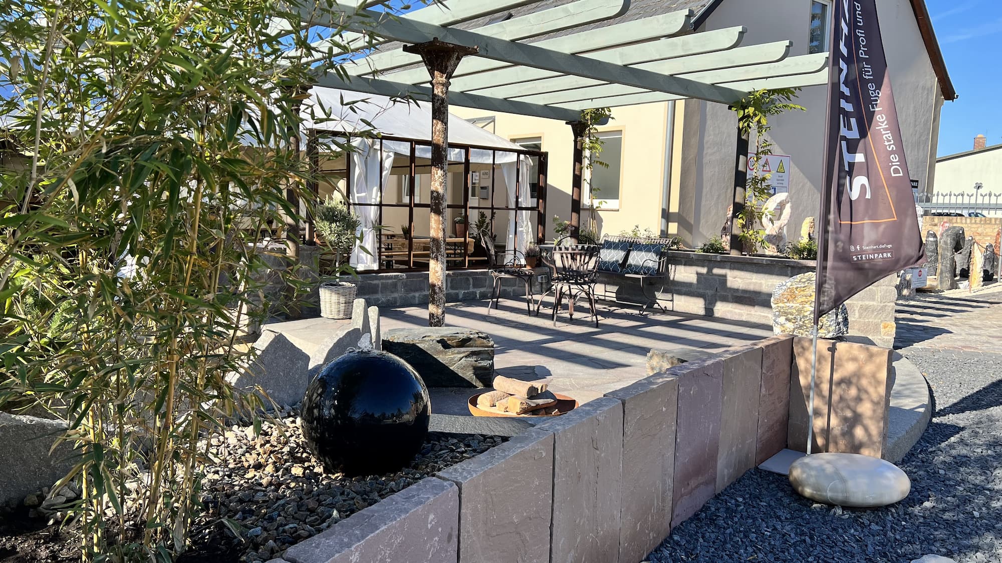 Auf unserer Musterfläche mit italienischem Flair haben wir eine Kombination aus Polygonalplatten, Formatplatten und Mauersteinen aus Porphyr in den Farben Rot-Braun-Bunt verbaut. Abgerundet wird der Bereich mit einer Pergola, die für zusätzlichen südlichen Charme sorgt. Gestaltungselemente wie Wasserspiele, eine Feuerstelle und Bambuspflanzen sowie ein Hochbeet ergänzen das mediterrane Ambiente. Die Sitzgruppe aus eisernen Outdoor-Möbeln lädt zum Verweilen ein. Wer die rustikale Optik etwas auflockern möchte, sorgt mit einem Loungeensemble für einen modernen Kontrast.